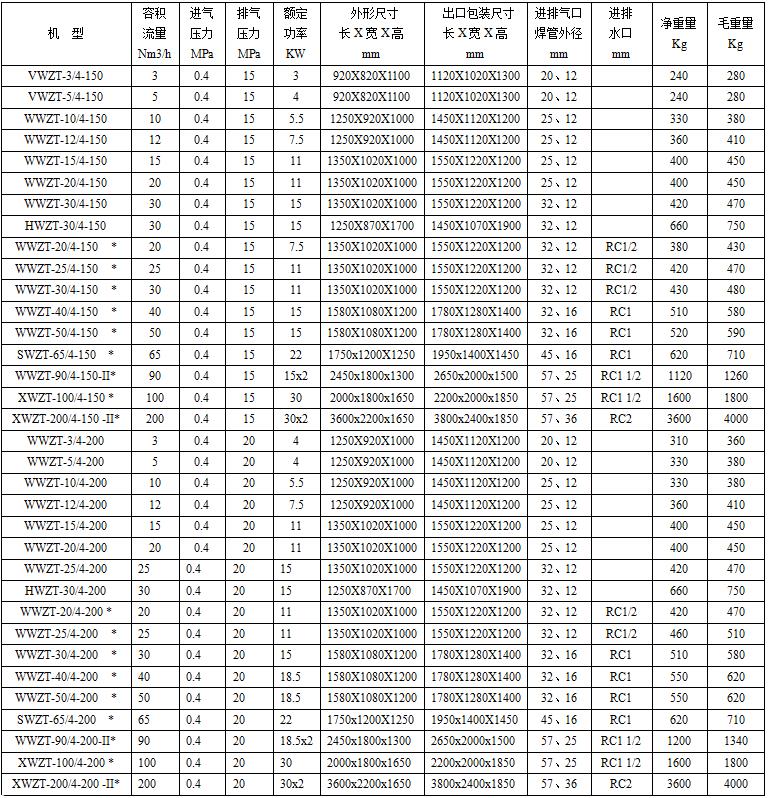 Oil-free High Pressure Nitrogen Compressors Technical Specification Table Models marked with * are water-cooled
